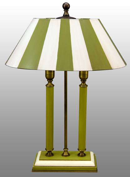 Holzsockel mit Messing - Strichlacklakierung und Patinierung in den Farben grün - creme. Umgearbeitet zu einer hochwertigen Leuchte, mit zweif flammigen E 14 Montage. Die Zuleitung ist ein ca. 2,50 Meter langes goldfarbenes 3 Aderkabel mit Zwischenschalter. Gesamthöhe der Leuchte incl. Lampenschirm beträgt ca. 65 cm. |